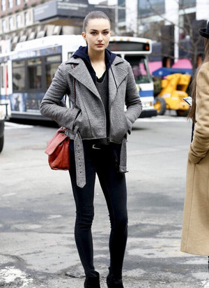 機車夾克搭配連帽衛(wèi)衣,酷勁十足,最好下半身再穿一條skinny jeans配上及踝靴,簡直酷斃了!