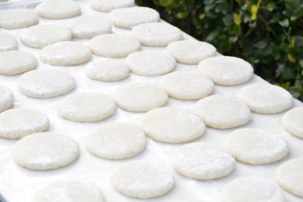 5、再加上少許的花椒粉,將其攪拌均勻,料汁就做好了,醒好的面團(tuán)移至在案板上,搟成餃子皮,放餡料捏好;